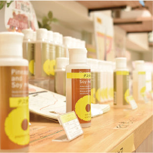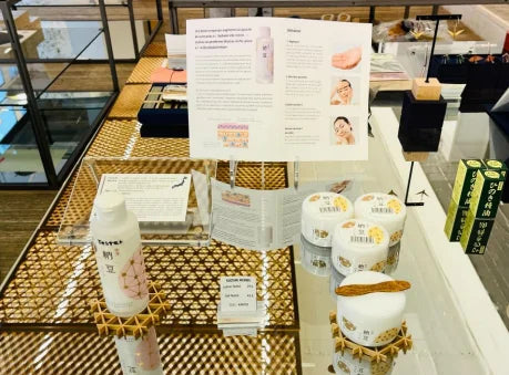 Des produits cosmétiques de soin contenant de l'acide polyglutamique, un ingrédient hydratant naturel dérivé du natto (soja fermenté), sont vendus chez Maison Wa, un showroom vendant des produits japonais à Paris, en France.